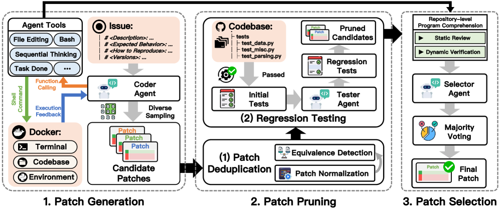 项目里提供了一个 Selector Agent, 该 Agent 在多个候选补丁( 使用 Trae Agent 生成)中进行剪枝,投票等流程,最终选出一个最合理的补丁,以提供解决问题的能力。